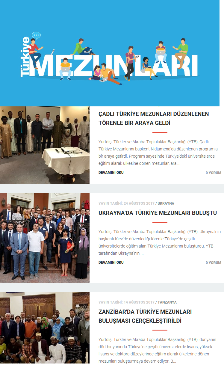 YTB tarafından Türkiye’de yükseköğrenim eğitimi alarak mezun olan ve hâlihazırda okumakta olan öğrencileri bir araya getirmek için hazırlanan, dinamik ve interaktif internet portalı “Türkiye Mezunları Web Sitesi” yayın hayatına girdi. Web sitesi ile mezunların birbirini tanıyarak bağlarını kuvvetlendirmek, Türkiye ile irtibatlarını korumak, Türk dili ve kültürüyle bağlarını sürdürmelerini sağlamak ve ülkeler arası ilişkileri geliştirmek hedefleniyor. Ayrıca uluslararası etkinlikler, bölgesel projeler ve mezun buluşmaları gibi kariyer ve işbirliği fırsatları da siteden duyurulacak.