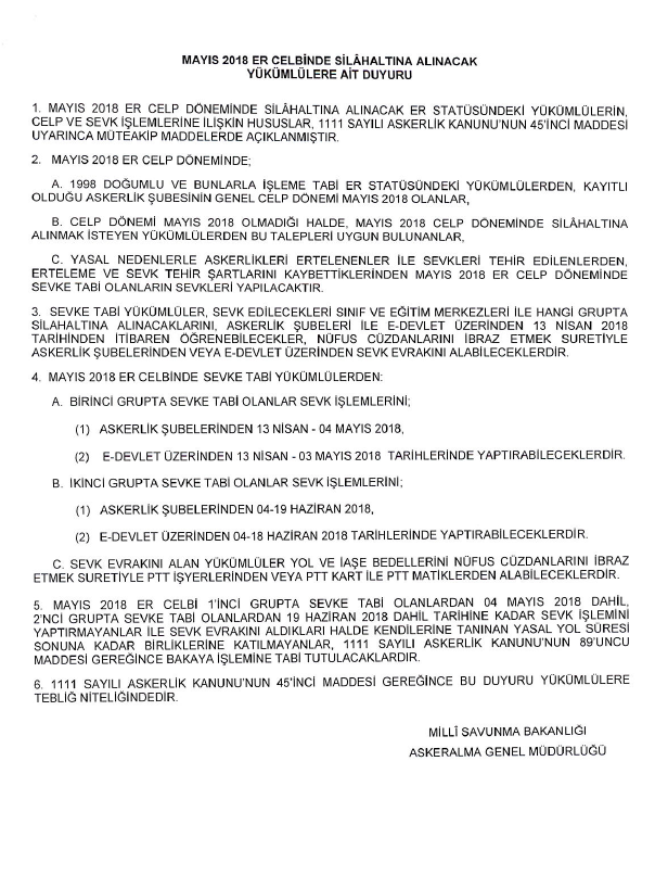 1111 sayılı Askerlik Kanunu gereğince,Mayıs 2018 er celp döneminde silah altına alınacak yükümlülerin celp ve sevk faaliyetlerine ait tebliğ yerine geçecek Milli Savunma Bakanlığı Askeralma Daire Başkanlığı'nın duyurusu ekte sunulmuştur.