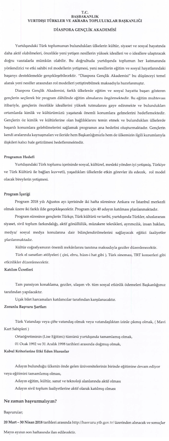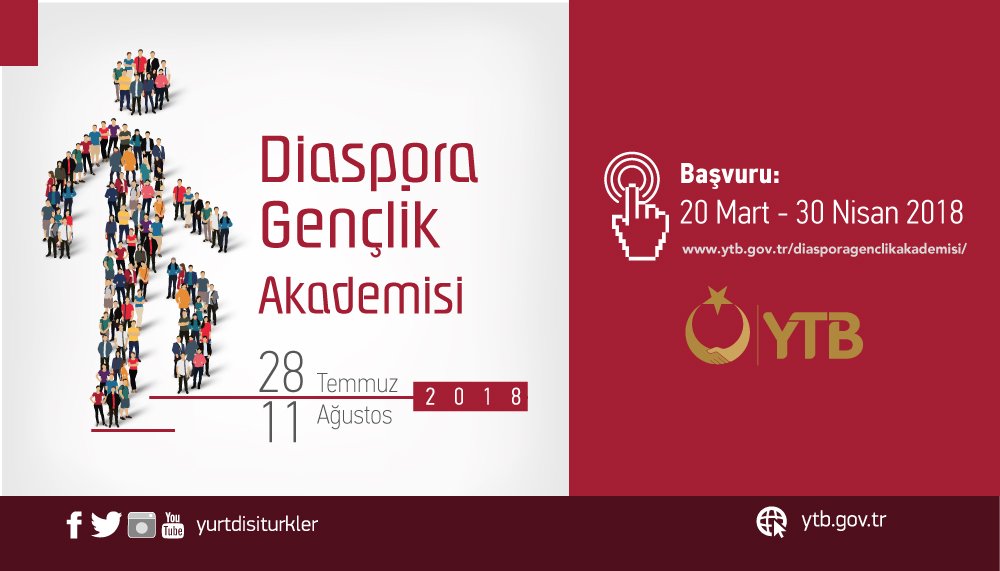 Yurtdışında yaşayan Türk vatandaşı ve mavi kartlı gençlerimizin, bulundukları ülkelerin kültür, siyaset ve sosyal hayatında daha aktif olabilmeleri, ülkemizle olan bağlarını güçlendirmeleri, Türkçe ifade becerilerini geliştirmeleri ve Türk tarih ve kültürünü yakından tanımaları amacıyla YTB tarafından 2013 yılından bu yana Genç Liderler adı altında yürütülen özel eğitim program, Yurtdışı Türkler ve Akraba Topluluklar Başkanlığı tarafından Diaspora Gençlik Akademisi adı altında yeniden tasarlanarak başvuruya açılmıştır. Konuya ilişkin duyuru afişi ve metni ekte sunulmaktadır.